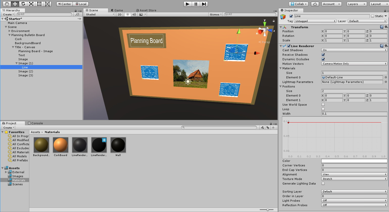 1. Add a Line Renderer GameObject as a child of the first blueprint image. Reset the Transform component by clicking on the cog in the top-right corner of the Component and clicking Reset.
