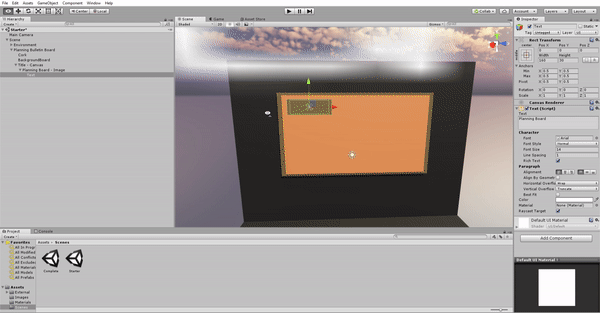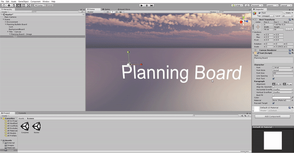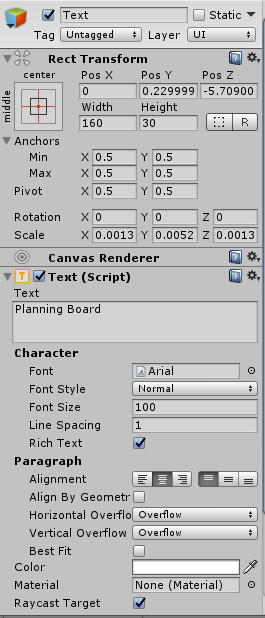 Add a Text GameObject. With white copy, title the board “Planning Board” and adjust the position/size with the Rect Transform/Anchor Presets components.