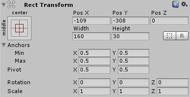 The Rect Transform is similar to the regular Transform Component. Whereas a standard Transform represents a single point in the 3D environment, a Rect Transform represents a rectangle that a UI element is placed inside.