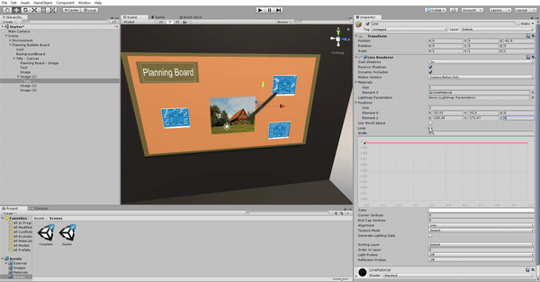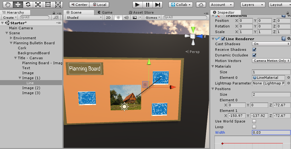 1. In the Line Renderer Component, adjust the Positions property's Element1 parameter so the line points towards the colored photo.