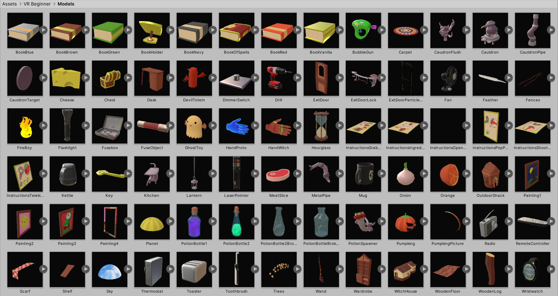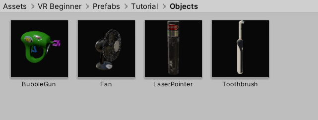 You can also find some preconfigured interactable objects in Assets > VR Beginner > Prefabs > Tutorial > Objects.