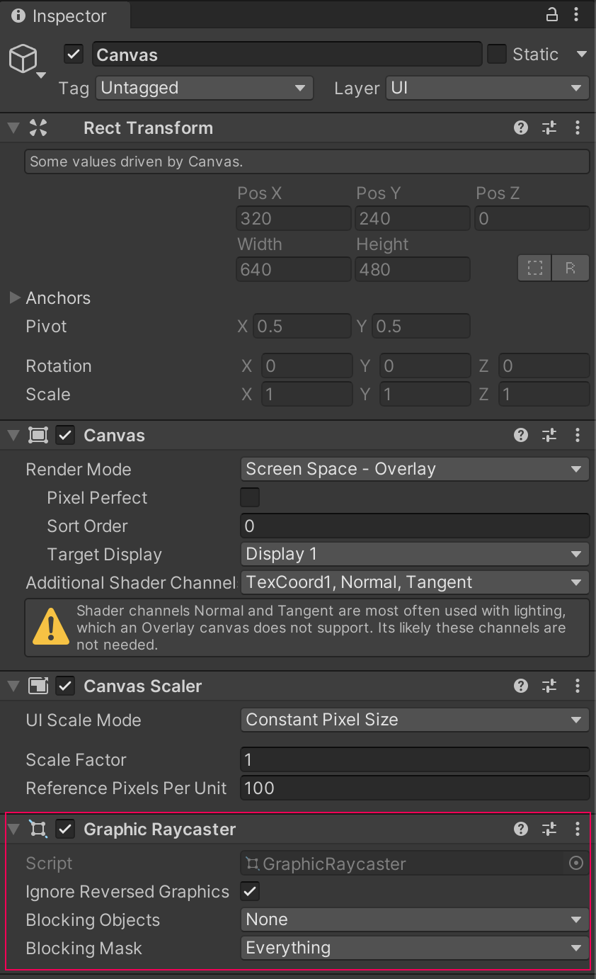 This part takes the form of a component called Graphic Raycaster which should be on the same GameObject as the Canvas. Note that these rays are different from normal physics rays in that they are blocked by UI elements rather than Colliders.