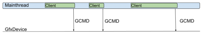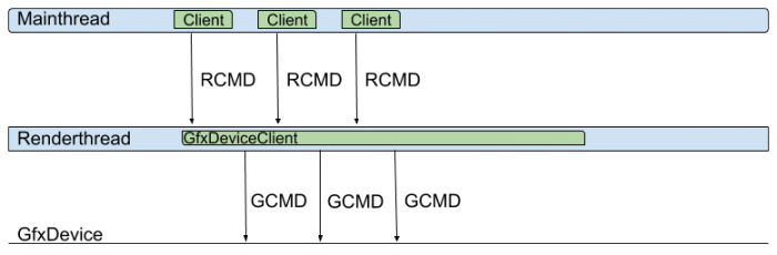 The single client forwards all the rendering commands (RCMD) to the renderthread - a special worker thread only for rendering - which owns the real graphics device GfxDevice and performs the actual rendering through the underlying graphics API (GCMD).