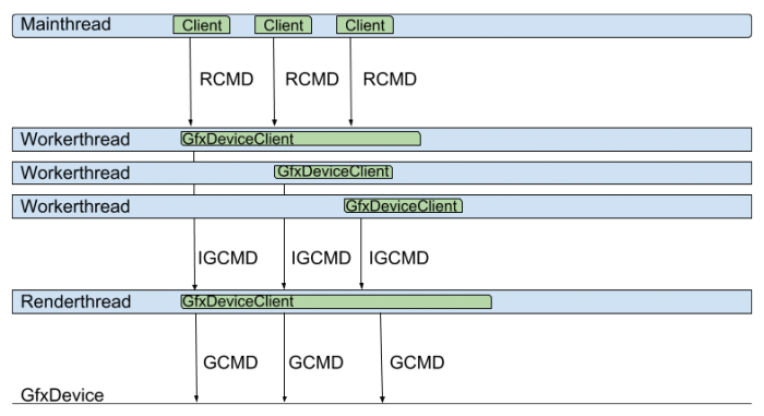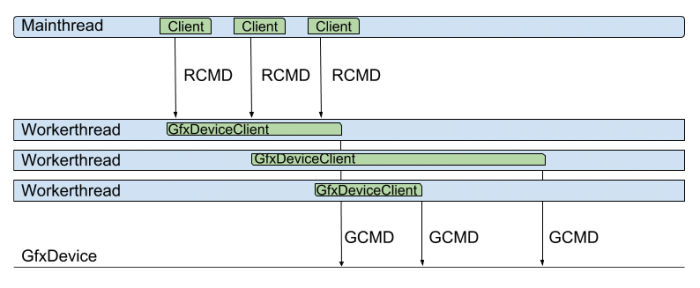 Multiple jobs, each of them running on its own thread, generate intermediate graphics commands (IGCMD). Afterwards, similar to Multithreaded Rendering (single client, single worker thread), a worker thread processes the buffered intermediate graphics commands and submits graphics commands (GCMD) to the real graphics device GfxDevice.