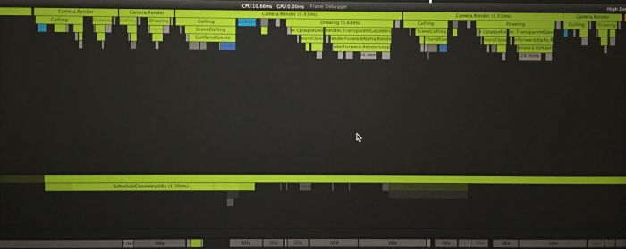 The Unity CPU Profiler shows the main thread in the timeline view. It indicates that there a multiple Cameras and you can see that Unity performs culling for each Camera.