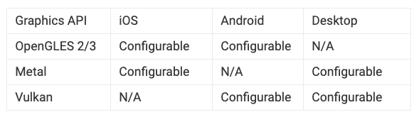 Graphics Jobs are available depending on the graphics API and target platform. The following table gives an overview of the availability of Graphic Jobs on each platform and Graphics API.