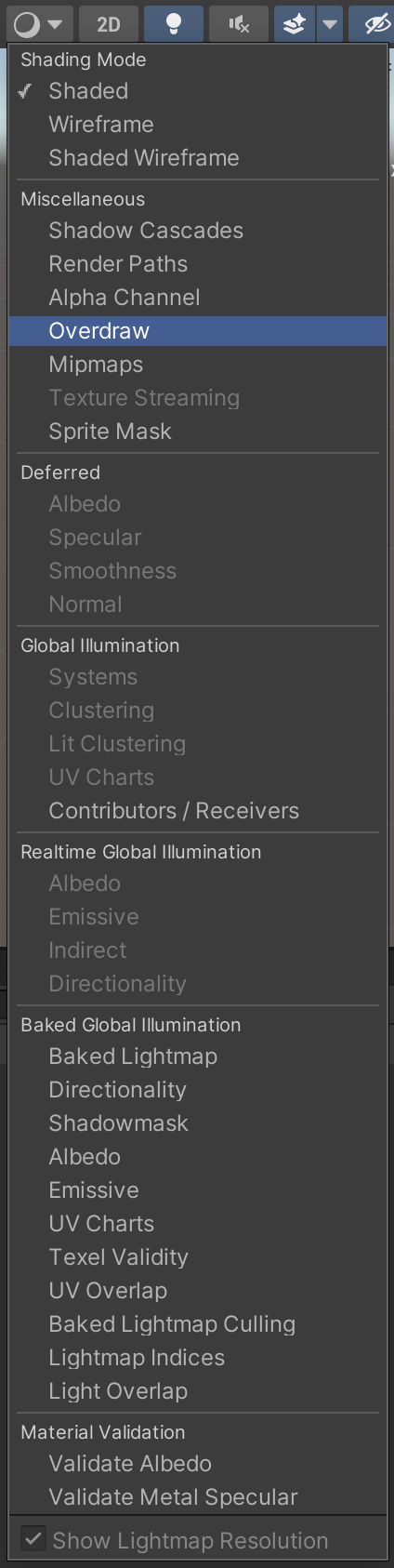 The Overdraw view allows you to see the objects that Unity draws on top of one another. You can view overdraw in the Scene View by using the Scene View Control Bar.
