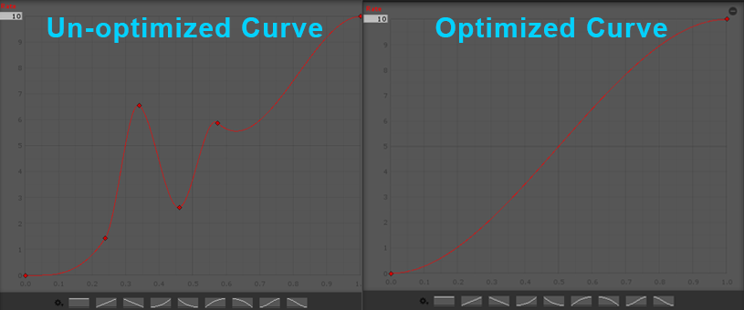 3. Restoring some of the depth with the larger angle decreased the particle count down to 30. Next let's take a look at the curves and make sure they are optimized. Typically you will want to make sure the curve is a smooth transition without any crazy hills or waves. This will lower the number of computations that need to be sampled from the curve for the particle effect (Figure 04).