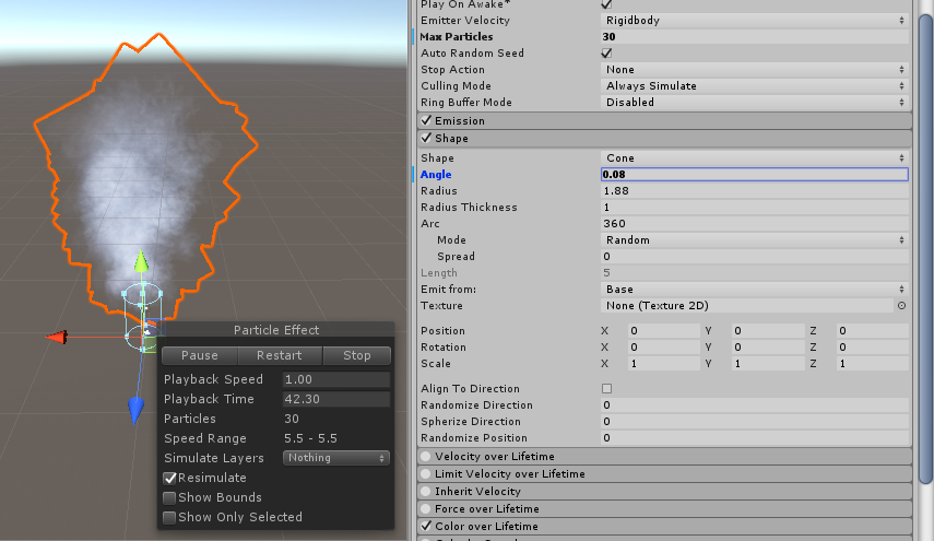 2. With the lower particle count, we can push it further, but we have already lost some of the thickness of the smoke. Next, let’s change the angle in the shape. With particle effects that have lower particle counts, we want to add a bit more variance to make up for the lack of thickness. I changed it from 0.04 to 0.08, doubling the angle (Figure 03).