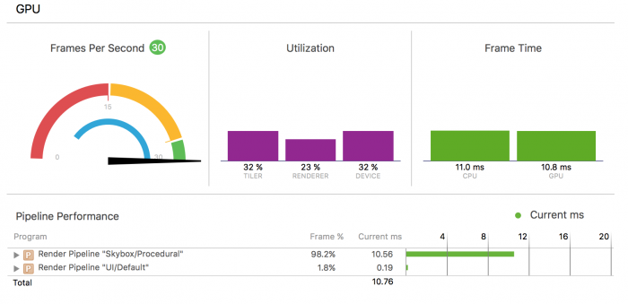 The external tools provide method-level CPU profiling with millisecond (or better) resolution, as well as detailed draw-call and shader profiling. Instructions for setting up and using the above tools lie beyond the scope of this guide. Note that the XCode Frame Debugger and Instruments are only usable on IL2CPP builds for Apple platforms, and therefore can currently only be used to profile iOS builds.