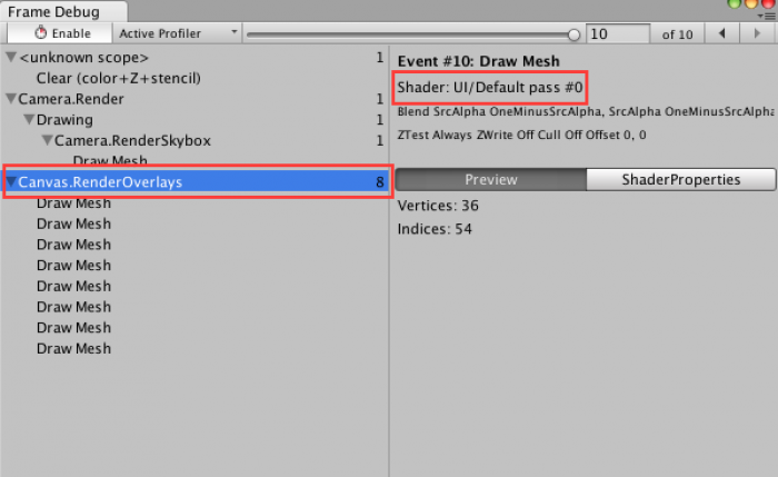 Notably, the frame debugger will update itself with the draw calls generated to display the Game View in the Unity Editor, and therefore can be used to try out different UI configurations without even entering Play Mode.
