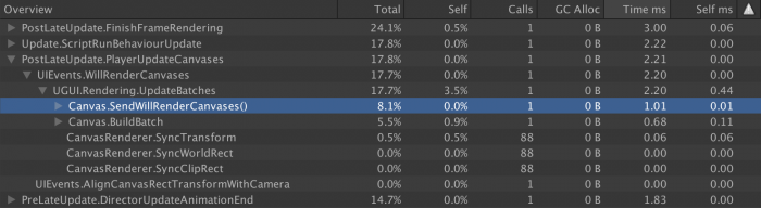 To analyze this, watch the Canvas.BuildBatch and Canvas.SendWillRenderCanvases lines in the profiler’s output.