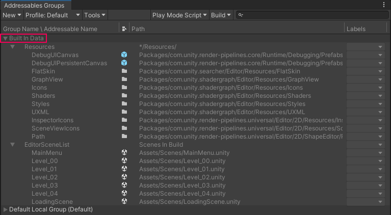 The Addressables system comes packaged with one built-in asset group template: Packed Assets.