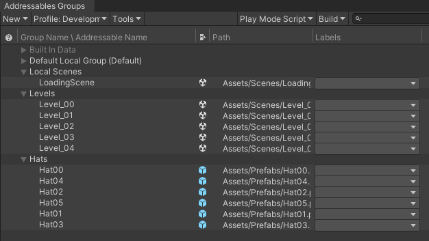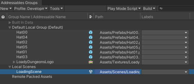 1. In the Addressables Groups window, make sure that the active Profile is Developer, which defines the phony URL for Remote.LoadPath.