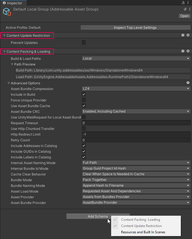 The Content Packing & Loading group schema was attached to the default asset group template Packed Assets, and now in Local Packed Assets and Remote Packed Assets templates as well. Recall that Content Packing & Loading informs the build scripts how they should build Addressables content.