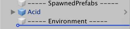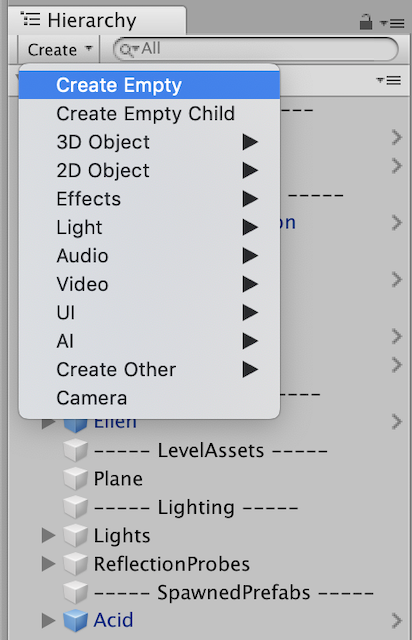When creating any Scene in Unity, it’s helpful to keep things tidy in the Hierarchy window so you can easily find GameObjects or game mechanics you are looking for. This section contains some tips that aren’t essential for using the Game Kit, but will help you keep your Projects organized.