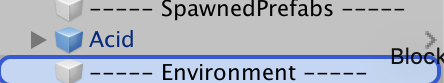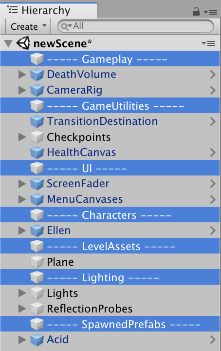 These sections have headers made of empty GameObjects. They have no function other than to help identify the types of GameObjects in the Scene. Note that the GameObjects underneath each section header are not children of that GameObject, and they shouldn’t be.