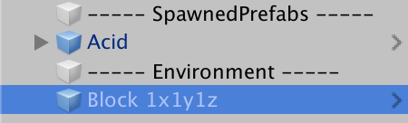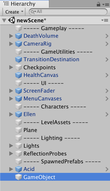 In the Game Kit’s Hierarchy window, we have created sections to categorize different types of GameObjects in the Scene.