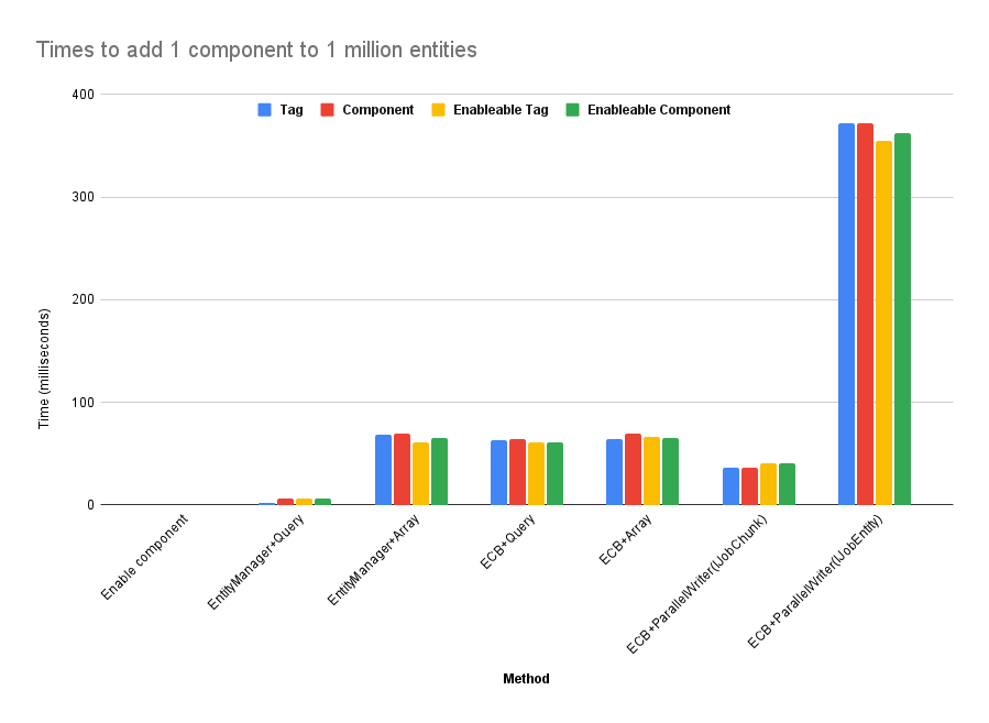 - ECB+ParallelWriter(IJobEntity): Use an IJobEntity across multiple worker threads to pass instructions to add components to entities one at a time to an EntityCommandBuffer, then execute that EntityCommandBuffer (time includes the ECB execution time)