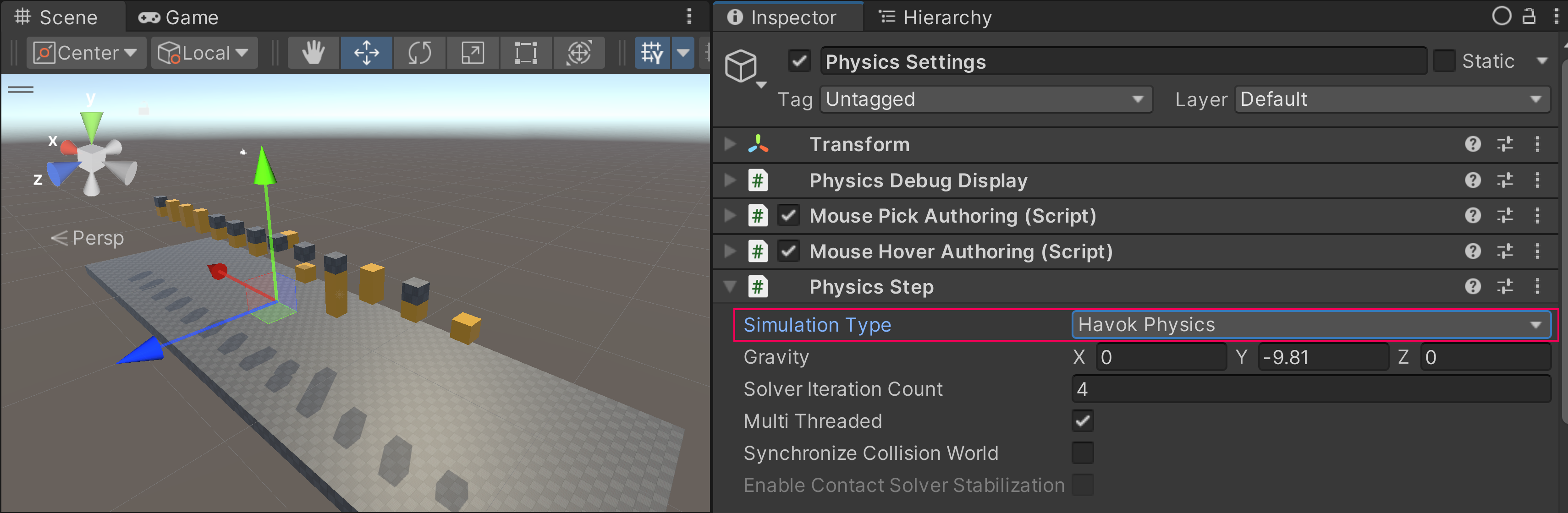 7. Inspector で、Physics Step コンポーネントに移動し、Simulation Type プロパティを見つけます。これを Havok Physics に設定します。