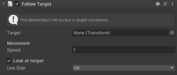 Adding the FollowTarget script to a GameObject forces the GameObject to follow a specified target indefinitely.