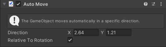 Note: If you are considering using this script on a prefab created with the help of the Object Shooter script, remember that Object Shooter already applies a force to objects when shooting them. In case of a non self-propelled object (like a rock fired from a catapult), you don't need Auto Move on the projectile.