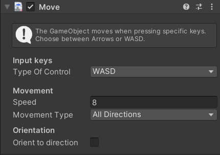 The Type of Control property assigns which control scheme the script uses (either the arrow keys or WASD). You can have two Move scripts in the scene and assign one to each player to create multiplayer games that can be played on the same keyboard.