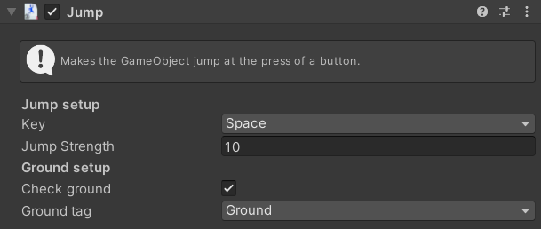 To stop the player from jumping in the air, enable Check ground and select a tag from the Ground tag dropdown. Then, you need to tag anything you want to consider ground with that same tag. As soon as the GameObject collides with the ground, it is able to jump again.
