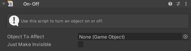 The On-Off script is used to turn an object on or off, meaning that the object’s Active flag is set to either true or false. You need to select the target in the Object to Affect property in order for this script to work.