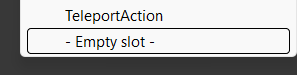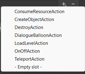 Tip: At the bottom of the dropdown, there is an option to add an empty slot. Having an empty slot is really useful when you want to connect an Action present on another GameObject to your current GameObject. This way you can break your logic into parts, which makes the logic easier to manage. To see this in practice, open the Roguelike example game and select the InvisibleTrigger object. Notice how 2 of the Actions are on separate objects parented to this one.