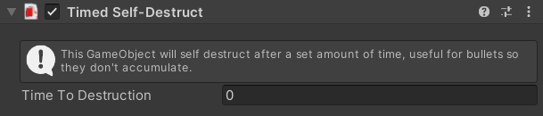 Use this script on any generated object, like projectiles for example, to make sure the scene doesn’t get too cluttered. Also, if your game generates a lot of objects, over time the performance of the game might slow down. Putting the TimedSelfDestruct script on those objects - even if the Time to Destruction is high - will help the game run better.