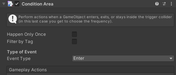 The ConditionArea script requires a Collider2D component set as Trigger. The Event Type property determines when the event occurs: on entering the area, on leaving it, or while staying inside (if you select Stay Inside, a Frequency property appears that allows you to determine how often the event happens).