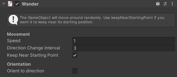 With the Wander script added, a GameObject randomly moves around in short bursts. The movement speed is controlled by the Speed property, which as usual goes together with the Friction property in the Rigidbody2D component to make the movement feel realistic.