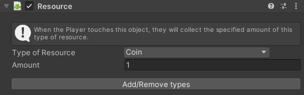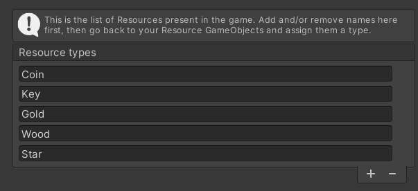 Several types have already been added for your convenience, but you can add more or remove existing ones to better suit your game. Once you add a resource type, be sure to go back to the object that has the ResourceAttribute script and assign it the correct type.
