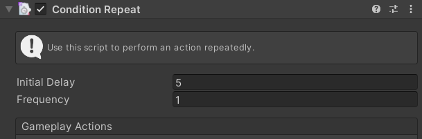 To make a programming comparison, the ConditionRepeat script is more like a WHILE than an IF. The script executes the list of Actions repeatedly without user input or interaction. The script has a Frequency property that controls how often (measured in seconds) an event happens, and an Initial Delay property that determines how long after a condition is met (also measured in seconds) for the event to trigger.
