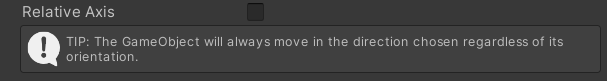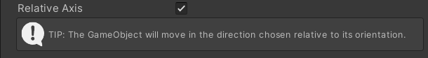 The tooltip below the option reflects the change that enabling or disabling the property will have. Generally, it’s a good idea to enable Relative Axis so that the object moves in a forward direction, no matter which way it is pointing.