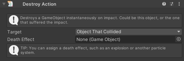 You can also set the Death Effect property, which generates another object when the Target object is destroyed. This Death Effect object could be a particle system, or other objects (like debris, a broken version of the object that was destroyed, etc.).