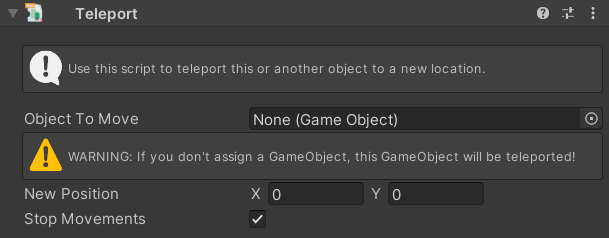 For objects that have a Rigidbody2D component, if you enable the Stop Movements property, in addition to being teleported to the new location, the object is also stopped, meaning the object’s speed and torque are zeroed, which is good for resetting the game state (for instance, after scoring in a sports game).
