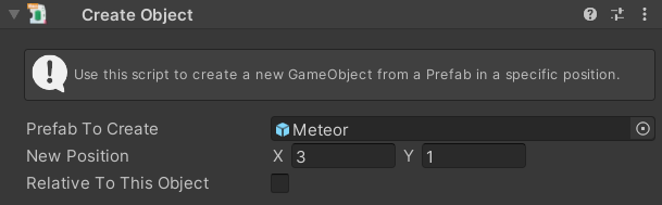 The CreateObject script generates a new object from a prefab. The object that is created can be selected using the Prefab to Create property.