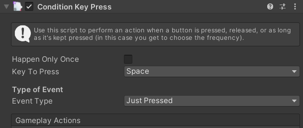 The ConditionKeyPress script is a generic way of binding an Action to a key press. In addition to being able to choose which key activates the event with the Key to Press property, you can also choose which type of key event triggers the event with the Event Type property: Just Pressed (similar to GetKeyDown), Released (GetKeyUp) or Kept Pressed (GetKey). As with other continuous actions, the Kept Pressed option has a Frequency property.