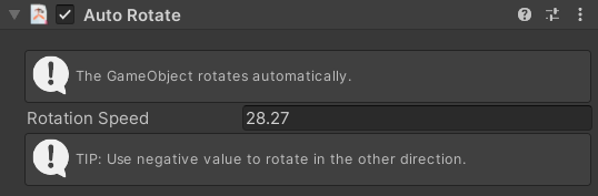 The AutoRotate script applies a continuous rotation to a GameObject on the Z axis. This script can be used to add movement to a decorative object, but can also create rotating obstacles in conjunction with the ConditionCollision script (referenced below). You can specify the speed of the rotation, and setting a negative speed makes the object rotate counter-clockwise.