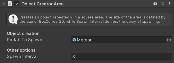 The ObjectCreatorArea script generates new objects from a prefab in a rectangular area. To work, this script requires a BoxCollider2D component (which is applied automatically when the script itself is applied) that defines the area where the instances appear.
