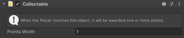 The CollectableAttribute script awards a point to any player who touches the object that has this script added to it. As such, this script requires a Collider2D component to function properly marked as a Trigger.