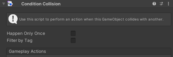 The ConditionCollision script is a simple condition that makes something happen when an object collides with the object that has this script. As with other conditions, you can filter which type of object actually produces the event by setting a tag in the Filter by Tag property.