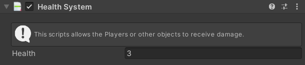The HealthSystemAttribute script can be added to characters, enemies, or objects. This script allows GameObjects to take damage and potentially be removed from the game if their health falls to 0 - which in the case of the Player might mean game over!