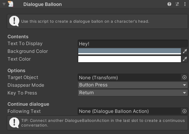Tip: Use chained DialogueBalloon scripts with no target and set the Disappear Mode property to Button Press to create small tutorials for your game!