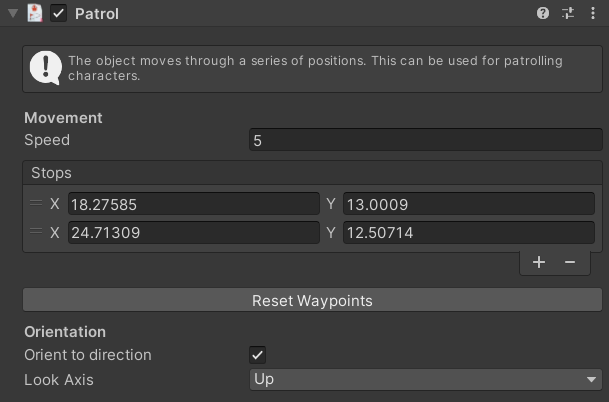 The Patrol script allows you to have an object move along a path made up of waypoints. These waypoints are organized in a list (Stops), so you can add, remove, or reorder them easily. The Reset Waypoints button clears the list of waypoints and adds one default stop.