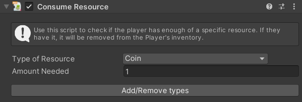 The ConsumeResource script is an event that is only triggered if the following condition is met: the player must have a certain number of objects in their inventory that have the same tag as the Type of Resource property of the script, and the number of objects must be equal to or greater than the quantity selected in the script’s Amount Needed property.