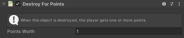 The DestroyForPoints script is good for targets and enemies in shooting games. This script destroys the GameObject on collision with another object, but only if this second object has the Bullet script. Also, the DestroyForPoints script awards points to the Player who originally launched the projectile.