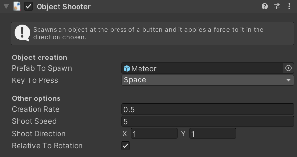 The Relative to Rotation property allows the direction of the shot to be rotated with the GameObject, so if (for instance) you use this script on an object like a spaceship that rotates, the shooting direction rotates as well. Disabling this property means the shooting direction is in World Space.